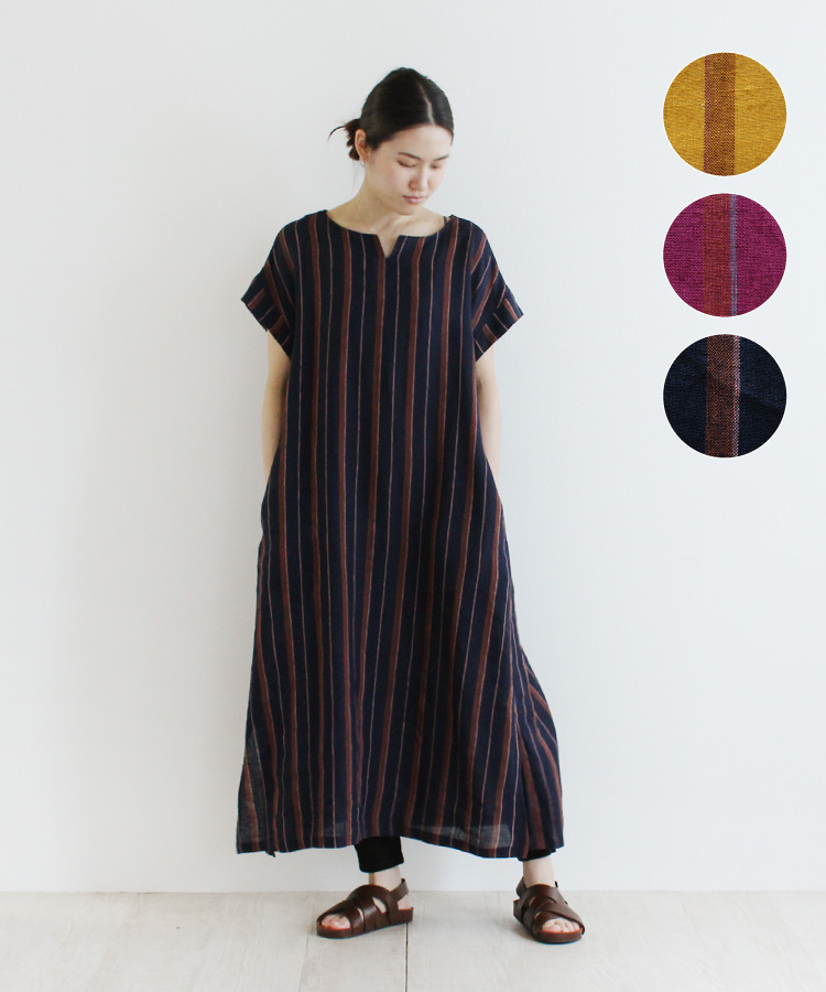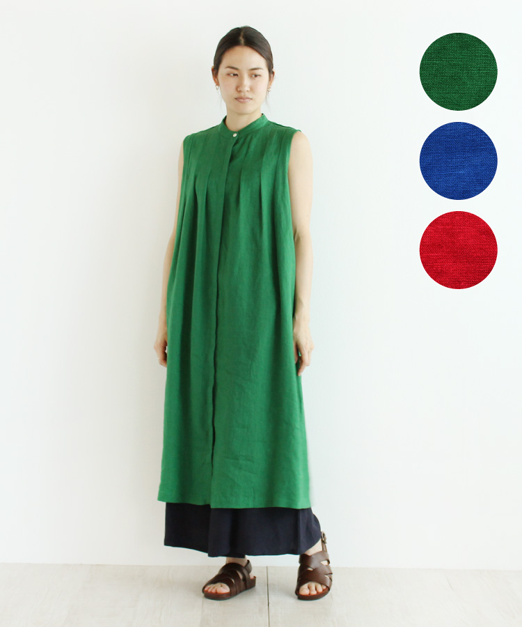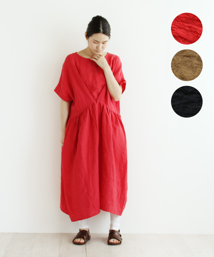 【nofl】リトアニアリネン半袖ワンピース《グリーン・ブルー・アカ》 新色追加しました